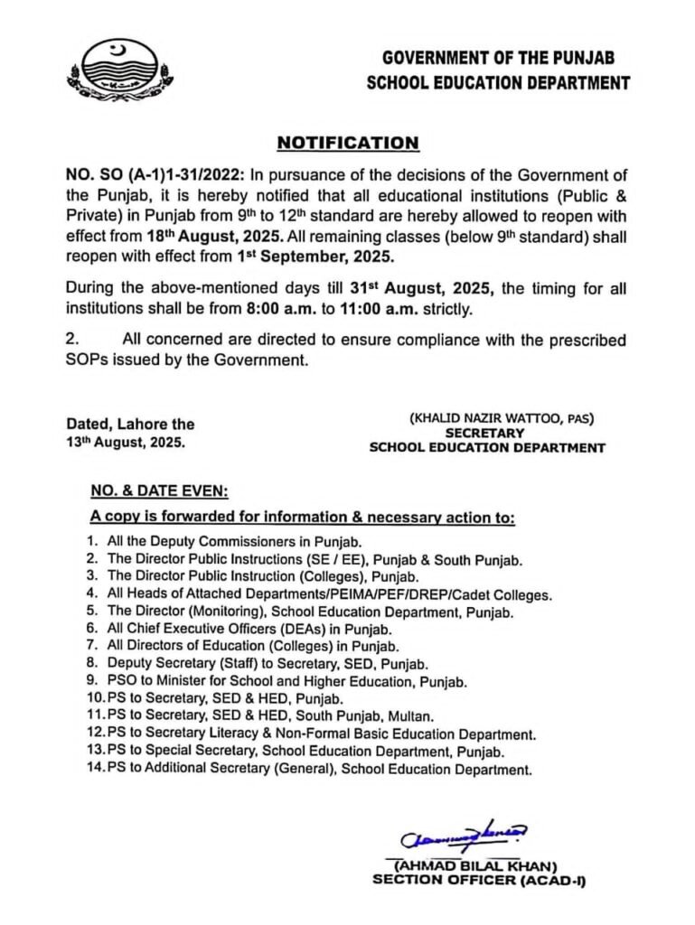 Classes for 9th, 10th, FA/FSc, O-Level, and A-Level students will resume on August 18, 2025, in both government and private institutions.